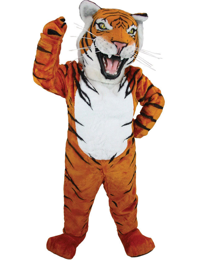Our Bengal Tiger Mascot Uniform is available for 24hr Quick Ship. Bengal Tiger has a zip back and is orange with black stripes and a white belly. The Mascot head is Orange with black stripes and a white mouth and ears. Bengal Tiger includes orange vinyl shoes and matching gloves. Additional Tigers are available, see item 43071, 43072 and 43074.
