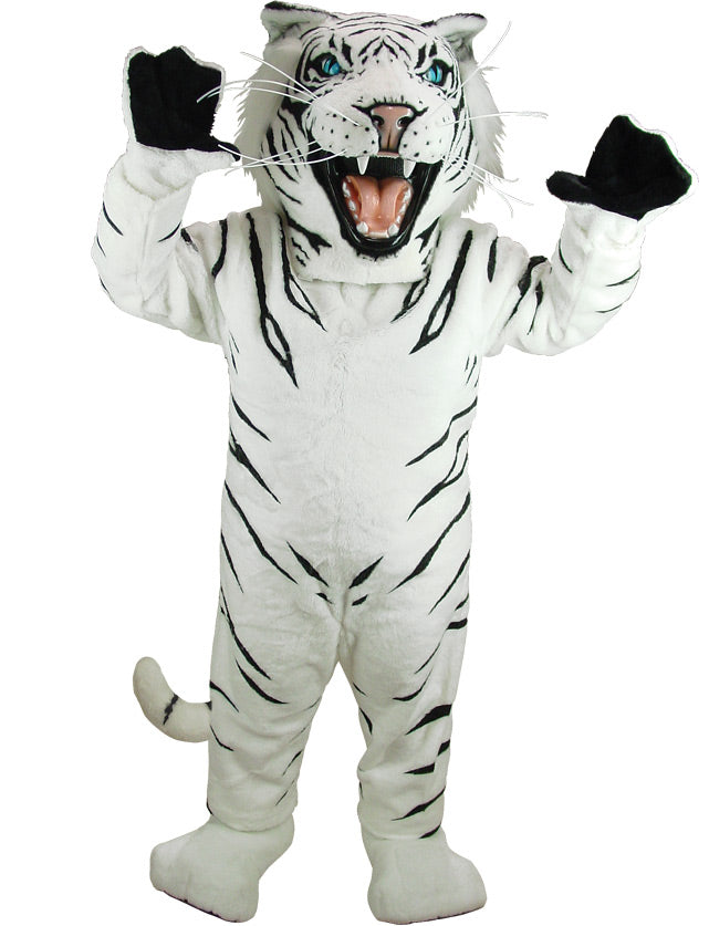Our White Tiger Mascot uniform is available for 24hr Quick Ship. This White Tiger Mascot has a zip back and has white with black stripes. The head of this Tiger is white with black stripes and piercing blue eyes. Costume includes white tiger gloves, and white vinyl soled mascot feet. And watch out for that long tiger tale. Additional Tiger uniforms available see item 40372, 43070, 43071.