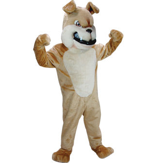Our Tan Bulldog Mascot uniform is available for 24hr Quick Ship. This bulldog mascot has a zipper back and a tan body and tail and a white belly. The mascot head is tan with a white mouth. Additional bulldog costumes available, see product number 25125 and 25426. Mascot includes tan gloves and tan vinyl soled bulldog feet.