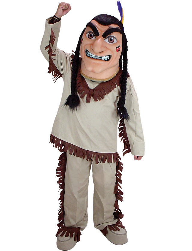 Our Indian Mascot Uniform comes with a two piece outfit that is tan with brown fringe accent. The mascot head has two long black braids, a feather and war paint on his face. All Mascots come complete with Head, Body, Mitts or Hands, and Feet or Spats (with a few rare exceptions). Shipping for the Indian mascot is 4-5 weeks after we receive your order.